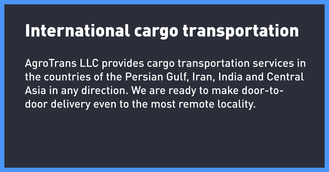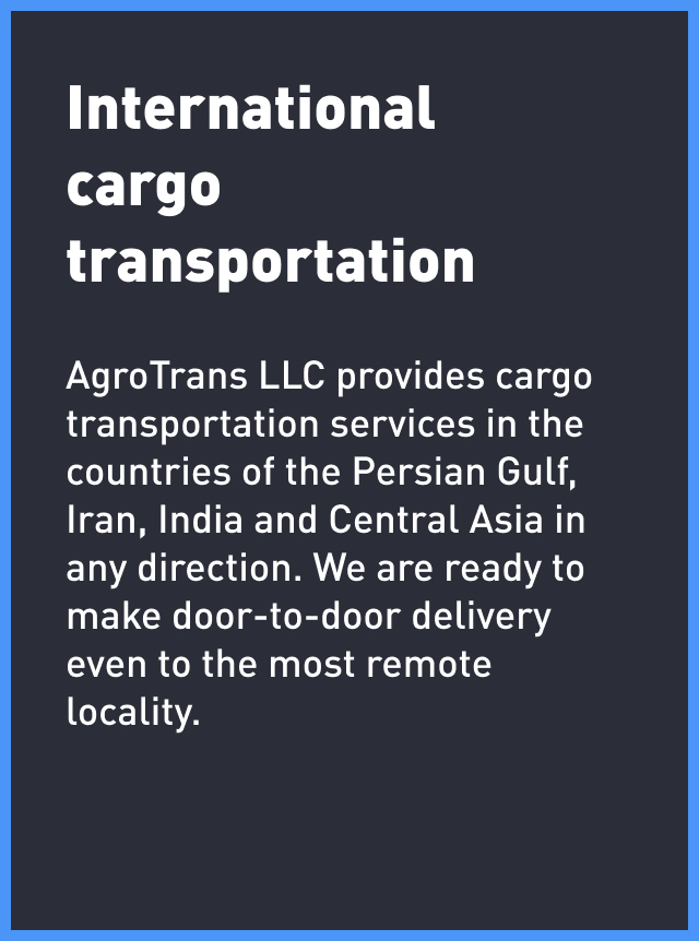 AgroTrans LLC offers qualified assistance in the delivery, export, import, transportation of goods of various categories to Iran, Kazakhstan, Turkmenistan, Azerbaijan, the UAE and India.